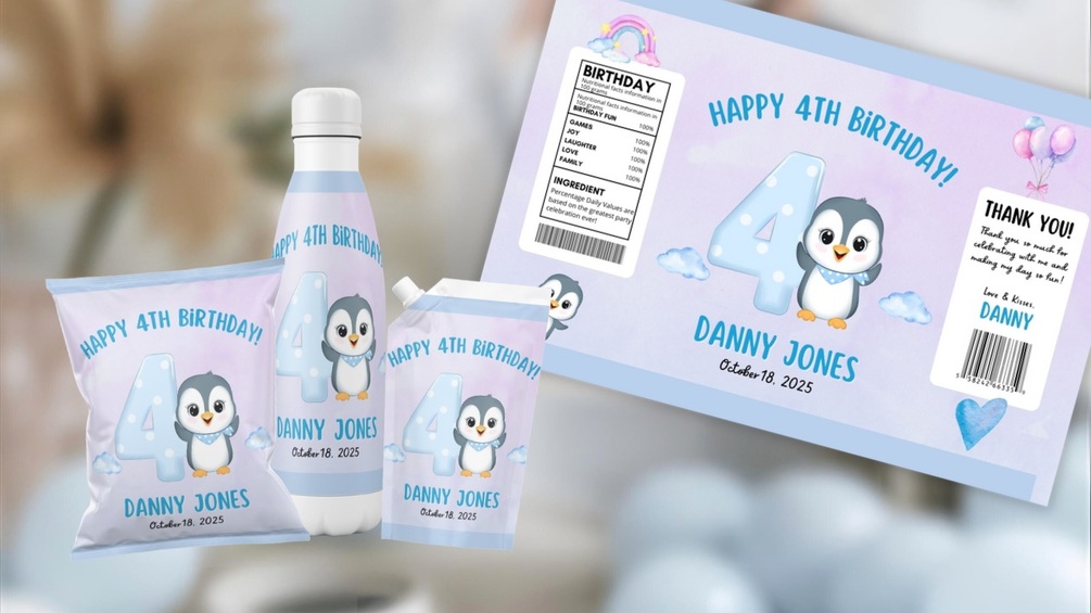 Celebrate your little one’s special day with this Scandinavian-inspired Penguin Birthday Bundle in soft light blue. Personalized with your child’s name, age, and details, it includes everything you need for a stylish and fun celebration!